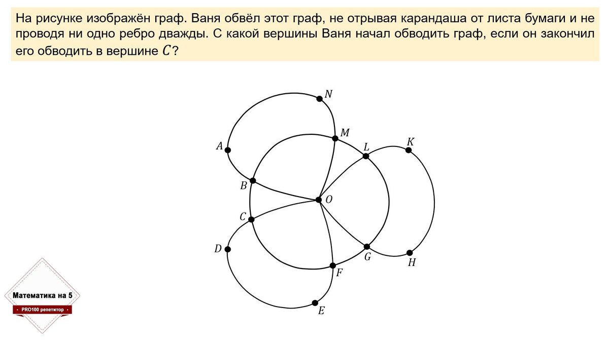 На рисунке изображён граф из 13 вершин. Ваня обвёл его одним росчерком — не отрывая карандаша и не проводя по одному ребру дважды. Известно, что закончил он в вершине C. Требуется определить, с какой вершины он начал. Что важно знать: степень вершины