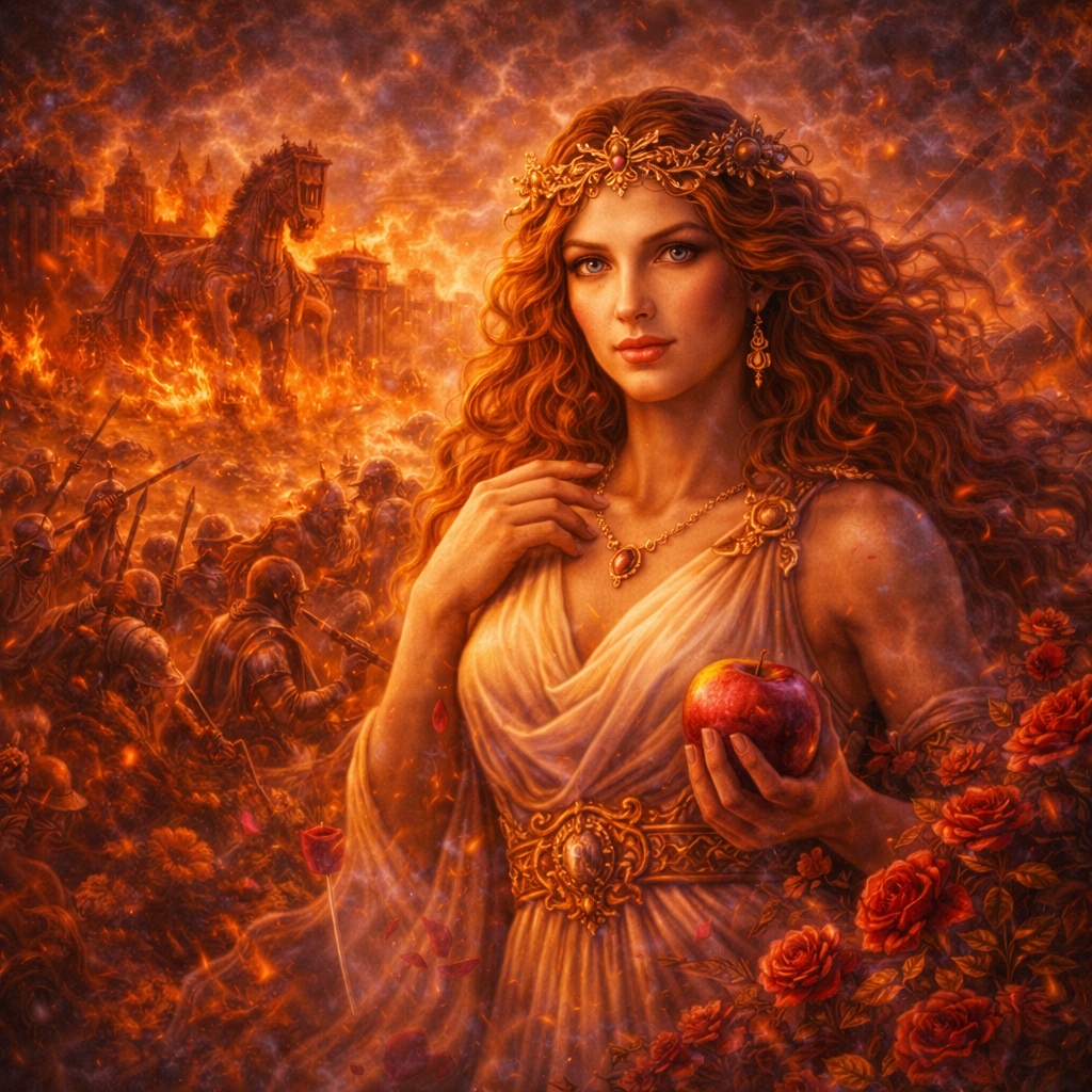 История Троянской войны обычно рассказывается как эпос о героях, армиях и осадах. Мы вспоминаем Ахилла, Гектора, хитрость Одиссея и деревянного коня. Но если внимательно посмотреть на древние мифы, становится ясно: в центре этой грандиозной войны стояла вовсе не армия и даже не царь. Всё началось с богини любви. Афродита — воплощение красоты, желания и страсти. Но в греческой мифологии она также является одной из самых опасных сил Олимпа. Потому что любовь, которой она управляет, способна разрушать города и судьбы. И Троя стала главным доказательством этого. Яблоко раздора История начинается не на поле битвы, а на свадебном пире. Когда бог Пелей женился на морской богине Фетиде, на праздник были приглашены почти все боги Олимпа. Почти все. Не позвали только богиню раздора Эрис. Оскорблённая, она бросила на пир золотое яблоко с надписью: «Самой прекрасной». Мгновенно возник спор. Три богини заявили свои права: