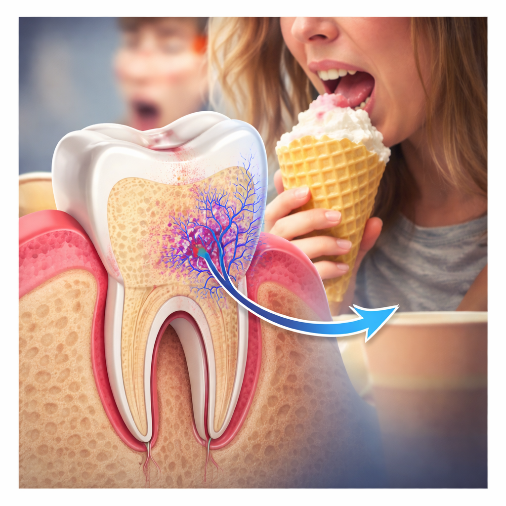 — «Это что-то серьёзное?» На самом деле причин может быть несколько, и некоторые из них совсем не связаны с разрушением зуба. Разберёмся, почему зуб может болеть, даже если он выглядит полностью здоровым. Одна из самых частых причин боли без кариеса — гиперчувствительность зубов. Она возникает, когда эмаль становится тоньше и открывается дентин — внутренняя часть зуба с микроскопическими каналами. Через них раздражители легко доходят до нерва. Боль обычно возникает при: Причины чувствительности: Обычно боль резкая и короткая, но очень неприятная. Иногда кажется, что болит зуб, но на самом деле воспалена десна вокруг него. Это может быть: Дополнительные признаки: Если проблему игнорировать, воспаление может перейти глубже и привести к расшатыванию зубов. Иног
