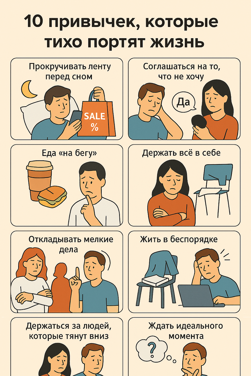 Есть вещи, которые мы делаем каждый день и даже не замечаем, как они тянут нас вниз. Не громко, не резко — тихо, по чуть‑чуть. Я долго не обращал внимания, пока однажды не поймал себя на мысли: «Почему я постоянно устаю, раздражаюсь и ничего не успеваю?»