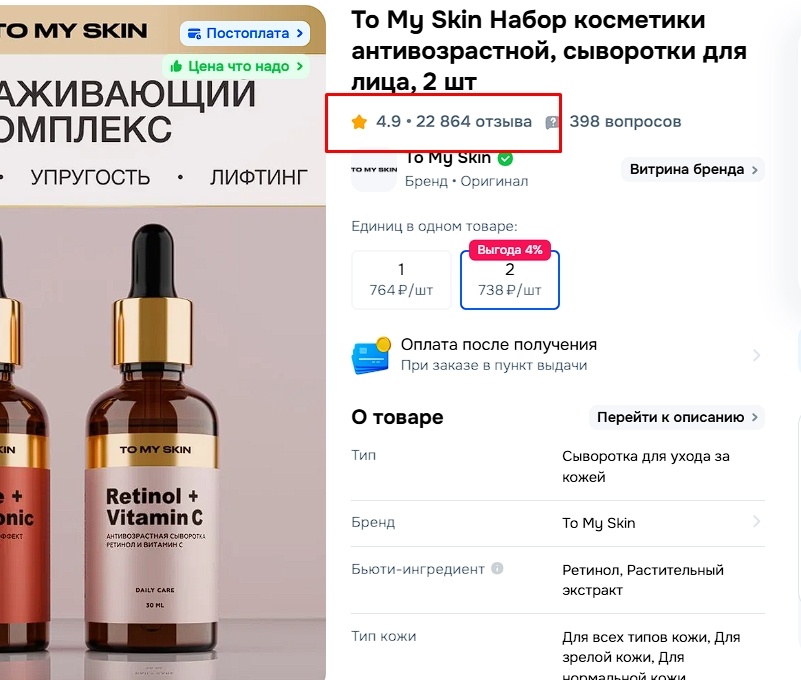 Набор To My Skin (две сыворотки с ретинолом и витамином С + подарок) как раз такой. В целом отзывы тёплые: люди пишут про приятную текстуру, увлажнение и мягкий антивозрастной эффект. Но копать глубже — и начинается детектив.