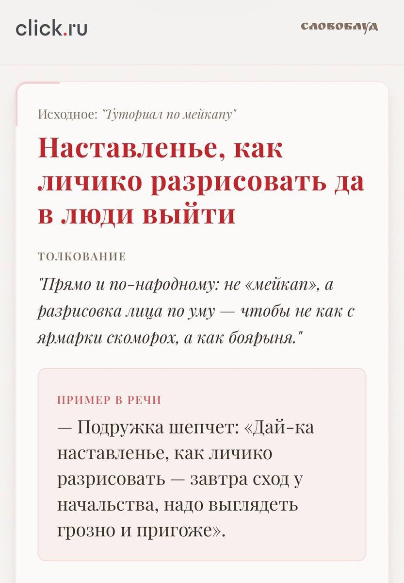 https://slovoblud.click.ru 😂 Ты им фразу - они тебе перевод на старославянский. Хорошо, что хоть не латынь. А то мало ли бы чего не вышло. Духи например из загробного мира.