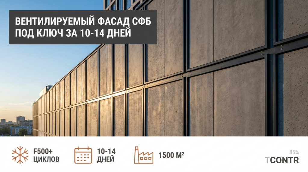 Разница почти четырехкратная. Для фасада площадью 2000 м² замена камня на СФБ снижает нагрузку на здание на 100 тонн. Это позволяет использовать облегченную подсистему и анкеры меньшего диаметра, что напрямую влияет на смету. Собственное производство Точка Контроля позволяет отливать тонкостенные панели (от 15 мм) с ребрами жесткости, которые выдерживают ветровые нагрузки на высоте 100+ метров, оставаясь легкими.