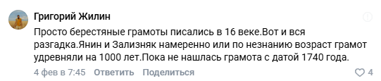 По факту вся аргументация сводится к: нам не нравится эта дата, поэтому мы её не примем. Аргументов против дендрохронологии и внятного объяснения как же грамоты попали в слои, над которыми потом сотни лет стояла застройка, нет совсем. Они просто опускаются. Вся суть претензий сводится к тому, что год написан не так, как хотелось бы авторам. Но тут я сделал своё предположение, как мне кажется, имеющее место быть.