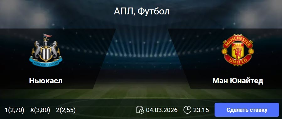) Статистика Ньюкасла: Статистические тренды указывают на высокую результативность матчей с участием «Ньюкасла»: в пяти последних играх АПЛ забивалось минимум три гола, при этом фиксировался обмен результативными ударами. На своем поле команда Эдди Хау демонстрирует завидную атакующую мощь, забивая два и более гола в 10 из 11 предыдущих домашних встреч. Статистика Манчестер Юнайтед: Атакующий потенциал гостей подтверждается цифрами: клуб забивал как минимум дважды в 6 из 8 последних матчей Премьер-лиги. Ставка «обе забьют» сыграла в 7 из 10 предыдущих игр чемпионата. На выезде манкунианцы не уступают на протяжении пяти туров, чередуя победы с ничейными исходами. 🎯 Обе забьют (Да) и ТБ (2,5) 🎲 кф (1,80) 🎯 ТБ (3) 🎲 кф (1,90) 👉 СДЕЛАТЬ СТАВКУ 🎁 ФРИБЕТ WINLINE - 3000₽ (промокод: BETWIN) 👉 СМОТРЕТЬ ПРОГНОЗ