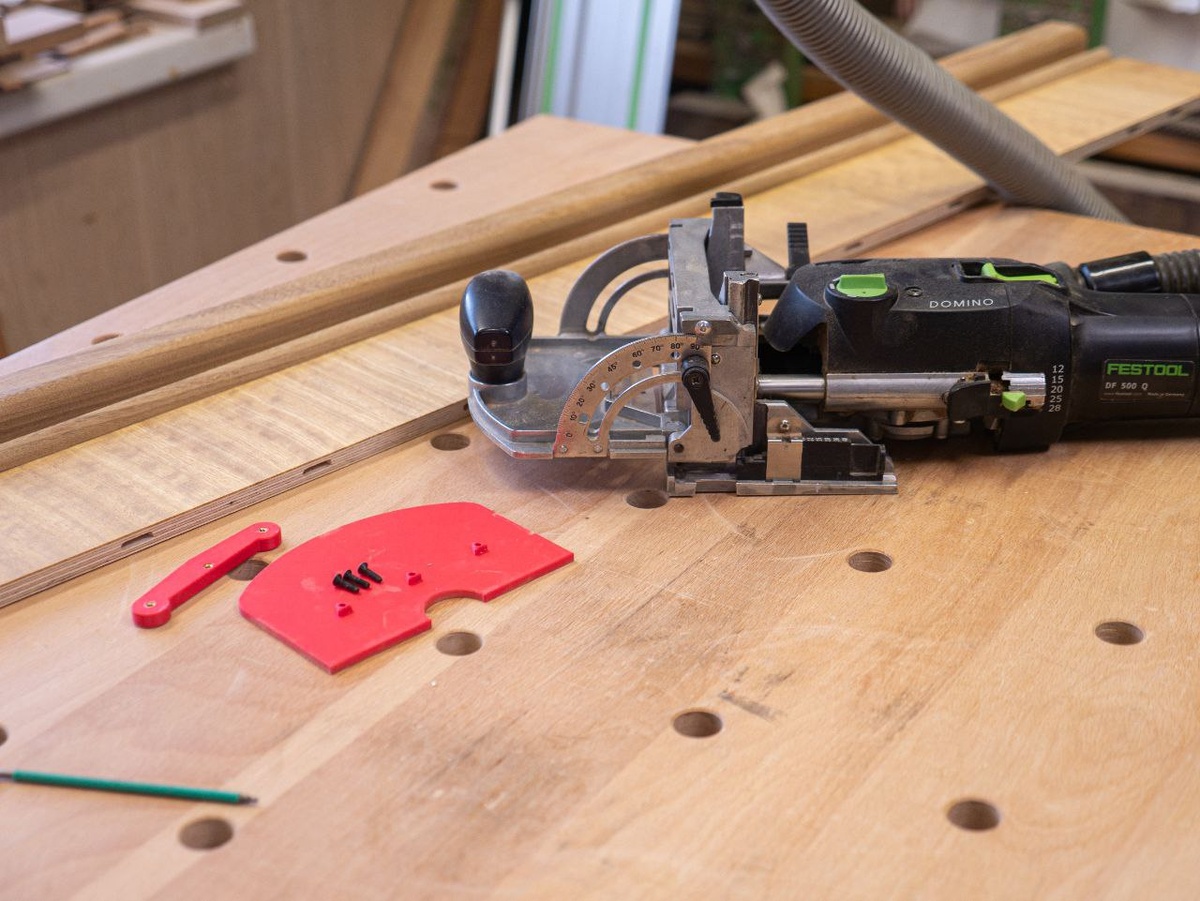 Редко, но бывает возникает необходимость доминошить (фрезеровать пазы под вставной шип Domino) тонкие заготовки, около 10 мм толщиной фрезой диаметром 4 мм. Опорная площадка фрезера так низко не опускается, чтобы паз расположить по середине кромки заготовки. Раньше мы выходили из ситуации приклеивая ламель толщиной 3-4 мм на двухсторонний скотч.