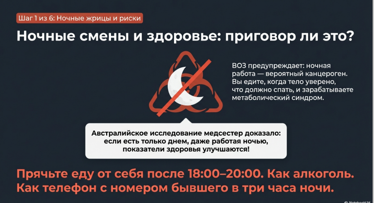 Всемирная организация здравоохранения уже давно высказалась: ночная работа – вероятный канцероген. Едите, когда ваше тело думает, что вы должны спать. А потом врачи удивляются: «Почему у вас метаболический синдром?» Но есть надежда: австралийское исследование показало: если медсёстры едят только днём, даже работая ночью, их показатели улучшаются. Вывод? Не «работайте меньше» и не «пишите заявление об увольнении». Вывод: прячьте еду от себя после шести-восьми (зависит от того, вы жаворонок, сова или голубь). Как с алкоголем. Как с бывшими. Как с соцсетями в три часа ночи. С вас лайк и подписка) Мой канал в телеграм https://t.me/zensovet1