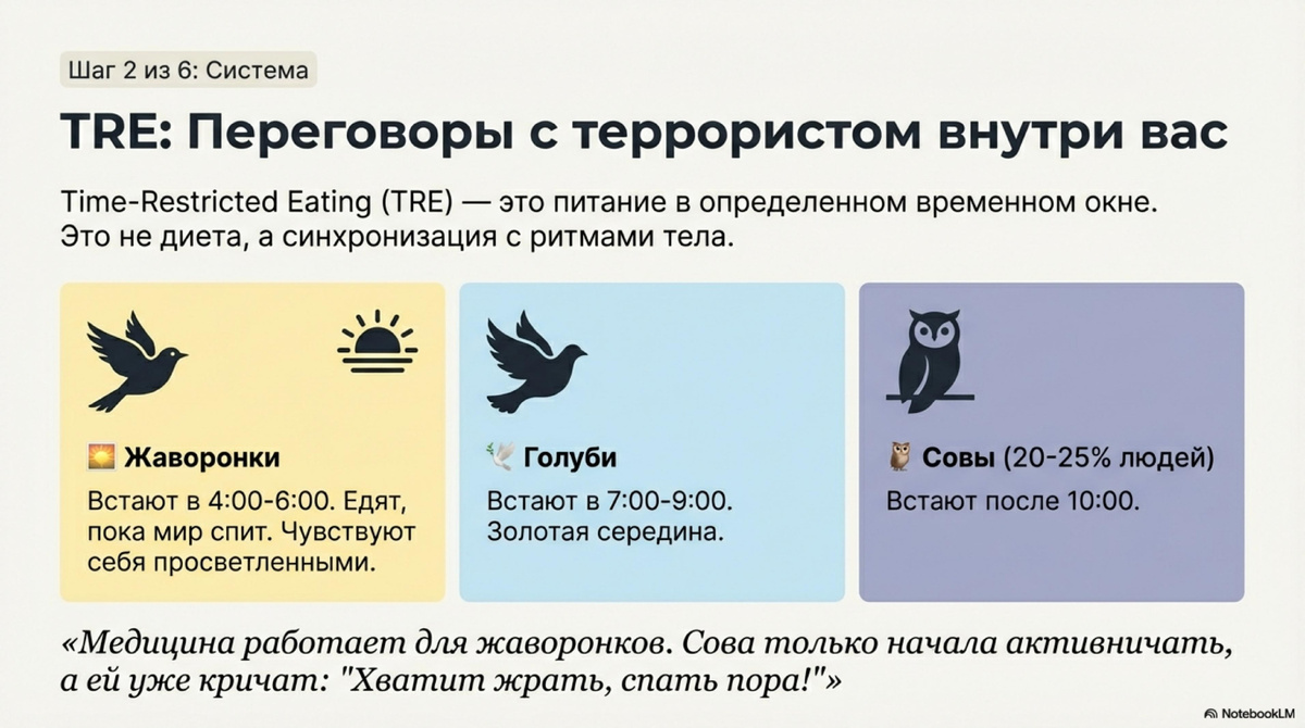 Time-Restricted Eating? Еда, с ограничениями по времени. Тема, известная давно. Но никогда не поздно повторить и вспомнить. К тому же, подъехали новые исследования. А это всегда добавляет интерес. Итак, Time-Restricted Eating (TRE) – это не диета, это переговоры с террористом внутри вас. Вам говорят: «Ешьте в окне восьми часов!» Звучит как приговор. Но есть нюансы. Если вы «жаворонок» - ваше окно 6:00–14:00. Вы едите, пока мир ещё не проснулся, и чувствуете себя просветлённым. Жаворонки встают в 4-6 утра, а ложатся в около 9 вечера. Другой тип: «совы». Просыпаются после 10 утра, а засыпают глубокой ночью. А есть еще «голуби»! Просыпаются в 7-9 утра. Засыпают до полуночи. Я по планам жаворонок, в мечтах сова, а приходится жить голубем. И знаете, что самое смешное? 20-25% людей «совы» по генетике. Но система рекомендаций по здоровью работает для «жаворонков». И вот «сова» только начала активничать, а «жаворонки» ей: «Хватит жрать! Уже поздно, спать пора!» С вас лайк и подписка) Мой канал