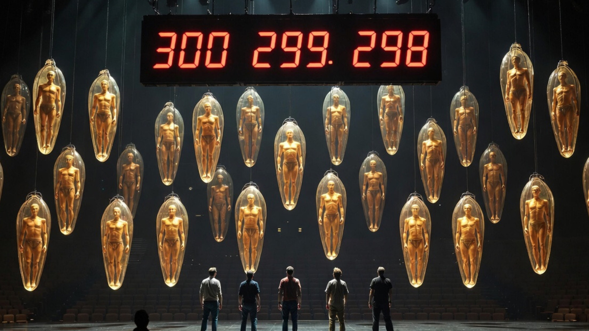 Таймер на невидимом табло отсчитывал секунды с неумолимостью приговора. 300. 299. 298. Красные цифры пульсировали в такт сердцебиению пятерых, стоящих на огромной пустой сцене. Перед ними, в прозрачных коконах, застыли их товарищи — двадцать две фигуры, похожие на спящих в янтаре насекомых. Настоящие, живые, но полностью отрезанные от реальности.