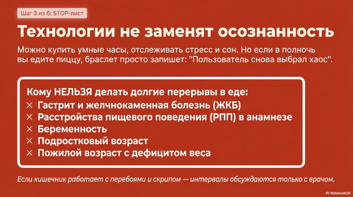 Например, вы доверили время еды умному приложению. Технологии помогут? Теперь у нас есть приложения: Circadian, MyCircadianClock. Они говорят: «Пора есть! Пора спать! Пора… перестать есть!» Вы носите часы, которые отслеживают вариабельность пульса, температуру, сон, уровень стресса… И всё равно в восемь вечера открываете холодильник и говорите: «Ну, давай, последний раз». Вы можете отслеживать каждый шаг, но если вы едите пиццу в полночь, то ваш фитнес-браслет просто запишет: «Пользователь снова выбрал хаос в своей жизни». Вам говорят: «Попробуйте интервальное голодание!» Вы: «О, это для меня!» И тут выясняется, что у вас: · гастрит, · желчекаменная болезнь, · РПП в анамнезе, · вы беременны, · вы подросток, · вы пожилой человек с дефицитом веса, · или просто у вас кишечник работает как старый лифт: с перебоями и скрипом. Все это противопоказания для долгих перерывов в еде. Тут обязательно решать вопрос частоты питания надо с врачом. С вас лайк и подписка) Мой канал в телеграм https://