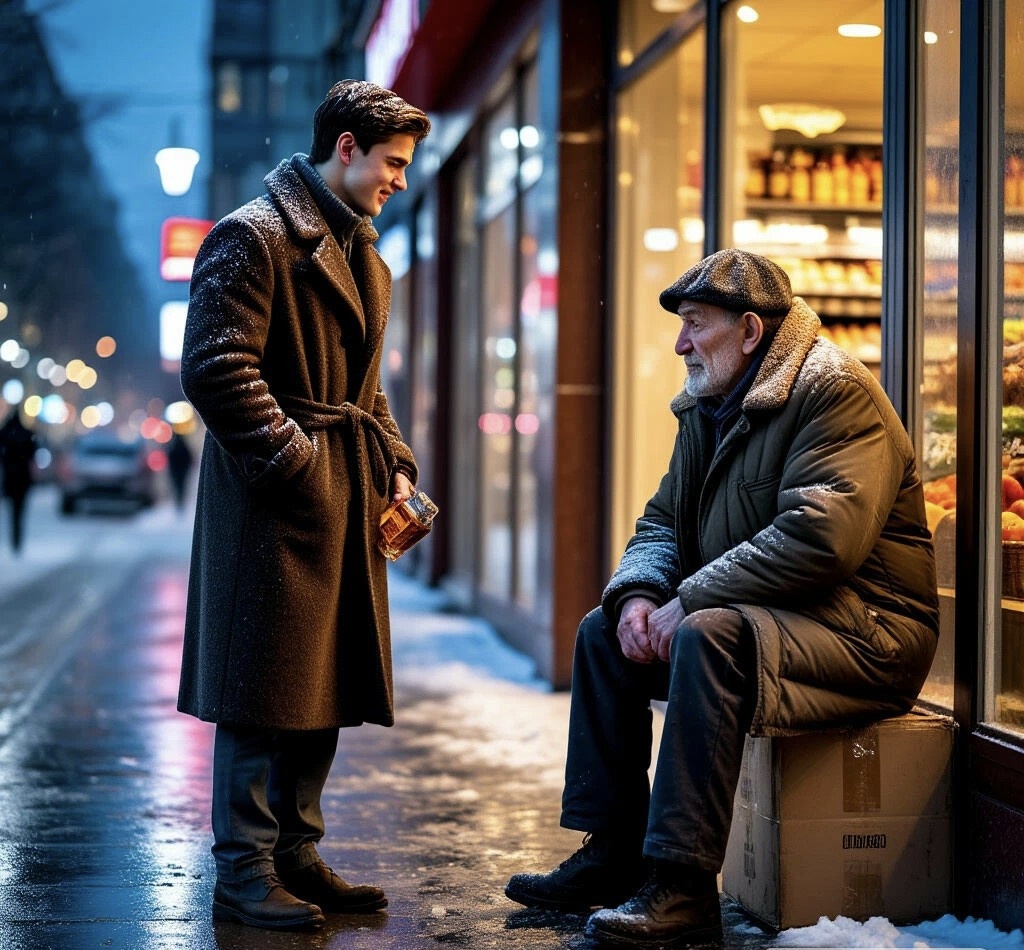 Глеб сидел на коленях в мокром снегу, сжимая в руках тёплую фляжку, и смотрел, как старик, согнувшись, стоит у входа в тот самый магазин, откуда год назад выходил он сам. И внутри у него всё переворачивалось от того, что человек, которого он презирал больше всех на свете, оказался единственным, кто не прошёл мимо.