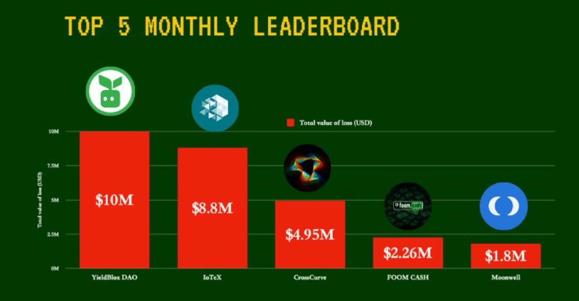Второй по масштабу инцидент затронул децентрализованный протокол цифровой идентификации IoTeX, который потерял 8.9 миллиона долларов из-за утечки приватного ключа. В целом февральские потери оказались на 69.2 процента ниже январских, когда общий ущерб превысил 86 миллионов долларов.