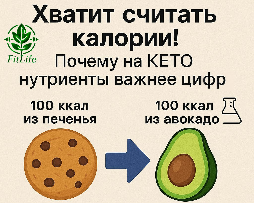 Ты годами считал калории, но вес возвращался? 📊⚖️ Пришло время понять: 100 калорий из авокадо и 100 калорий из печенья — это не одно и то же! Особенно на кето-диете. Вот почему твой фокус должен сместиться с цифр на питательную ценность 🥑➡️🧠 Твоё тело — не печь, а сложная лаборатория 🔬. Еда — это сигнал для гормонов! Резкий скачок сахара 📈 → выброс инсулина (гормон запасания жира!) Быстрый спад энергии 📉 → голод через час Результат: жиронакопление + переедание Стабильный сахар в крови ➡️ → инсулин в норме Долгая сытость + полезные жиры/клетчатка Результат: жиросжигание + энергия Вывод: Кето работает через управление инсулином, а не через счёт калорий! Можно есть сосиски, плавленый сыр и пить колу без сахара 🚮 Углеводов мало, но твоё тело не обманешь! Последствия: -Дефицит магния, калия, витаминов В 💊 -Усталость, туман в голове, выпадение волос 🤕 -Хроническое воспаление 🔥 Запомни: Кето — это не просто «нет углеводам», а да — нутриентам! -Авокадо, оливковое масло Extra Virgin ?