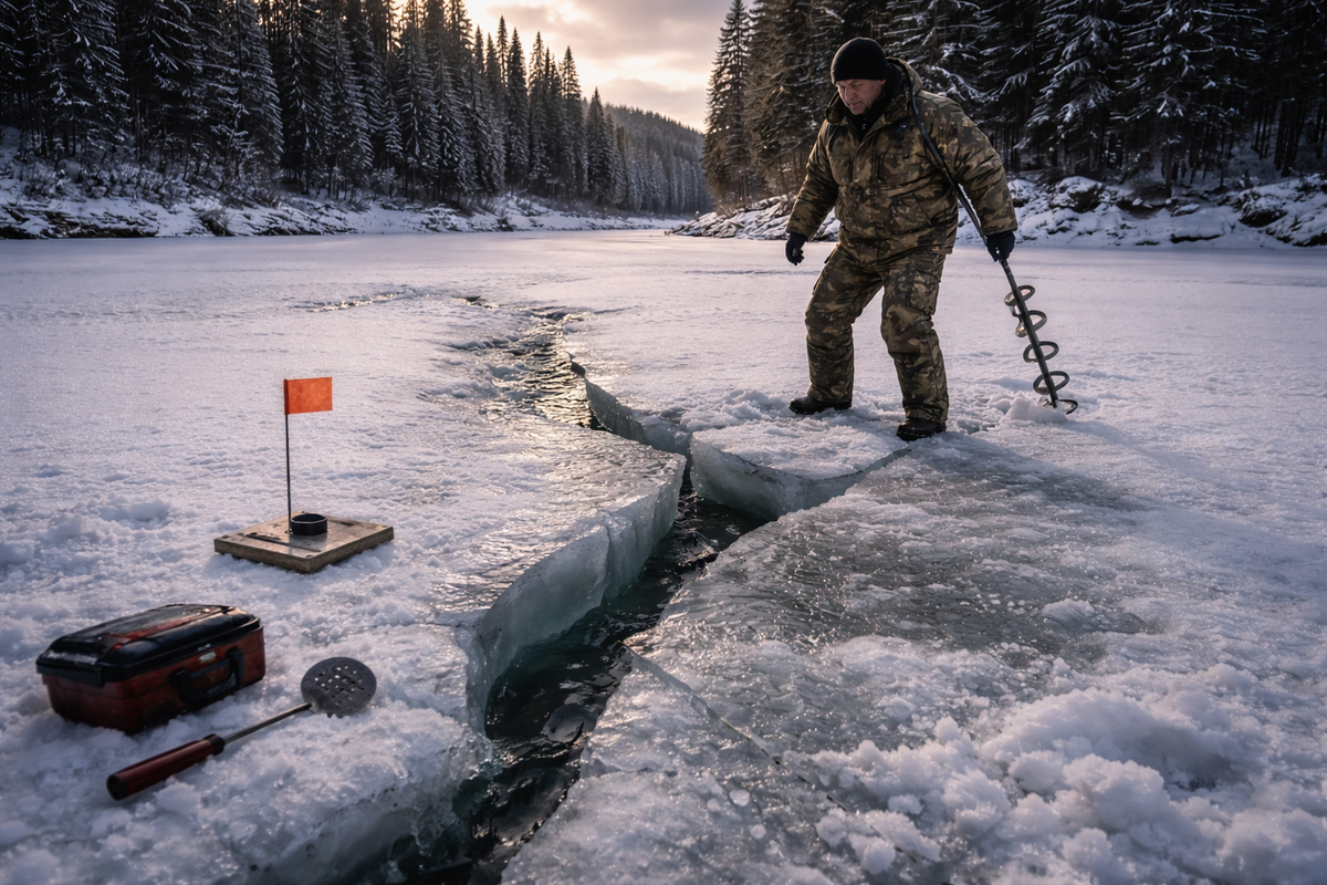 Зимой таёжная река выглядит спокойной. Сверху — белая равнина льда и снега. Но под этим спокойствием всегда идёт вода. Быстрая, тяжёлая, холодная. И иногда она напоминает о себе в самый неподходящий момент. Я жил тогда в небольшой избушке на притоке большой северной реки. Место глухое — вокруг сопки, ельник и длинные километры тайги. Зимой туда никто не приходит, кроме редких охотников. Основной моей добычей в ту зиму была рыба. На этой реке хорошо ловился налим — особенно в морозы. Лучший способ — ставить жерлицы на глубоком плёсе у поворота. Туда я и шёл тем утром. Мороз стоял крепкий, под тридцать. Снег скрипел под валенками. С неба светило бледное зимнее солнце. Плёс находился примерно в километре от избушки. Место я знал давно. Лёд там обычно толстый — больше полуметра. Я начал ставить жерлицы. Просверлил первую лунку, опустил снасть, поставил флажок. Потом вторую. Потом третью. Всё шло спокойно. Но когда я пошёл ставить четвёртую, под ногами вдруг раздался звук. Глухой треск. Не