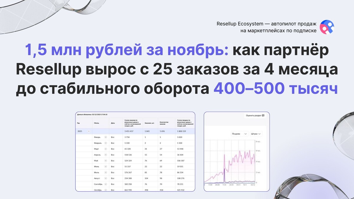 И уже спустя несколько месяцев работы с нами его оборот превысил 1,5 миллиона рублей. Стабильный ежемесячный оборот – 400–500 тысяч рублей. Это не разовый всплеск и не случайность. Это системный результат, который он получает месяц за месяцем.