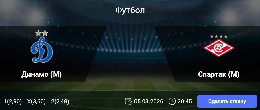 ) Статистика Динамо Москва: Статистика последних семи кубковых матчей «Динамо» показывает, что ставка «обе забьют-нет» проходила шесть раз. Однако на своем поле в рамках этого турнира динамовцы выступают нестабильно: в семи предыдущих играх зафиксирована лишь одна ничья и четыре поражения, при этом в семи из девяти случаев пробивался тотал больше 2,5. Статистика Спартака: История личных встреч также благоволит гостям: в восьми последних официальных матчах против «Динамо» они уступили лишь однажды, одержав четыре победы. В текущем розыгрыше Кубка «Спартак» демонстрирует отличную гостевую форму, выиграв пять раз подряд. В пяти из шести последних выездных встреч голы забивались в обоих таймах. 🎯 ТБ (2,5) 🎲 кф (1,85) 🎯 X2 и ТБ (2,5) 🎲 кф (2,75) 🎯 Спартак выйдет в следующий раунд 🎲 (1,55) 👉 СДЕЛАТЬ СТАВКУ 🎁 ФРИБЕТ WINLINE - 3000₽ (промокод: BETWIN) 👉 СМОТРЕТЬ ПРОГНОЗ