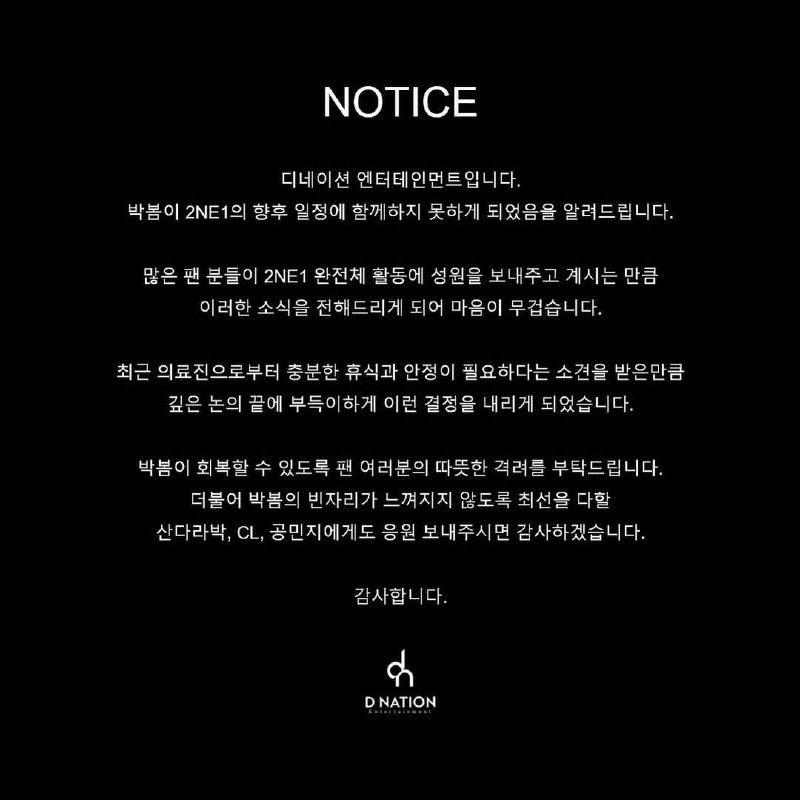 6 августа 2025 года D-Nation Entertainment сообщили, что Пак Бом больше не будет участвовать в деятельности 2NE1