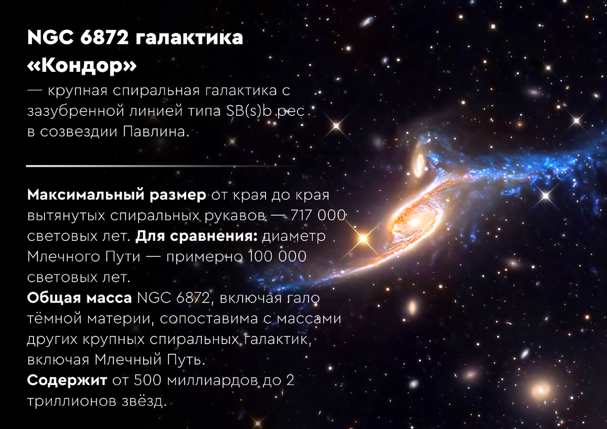 Глядя на NGC 6872, мы словно заглядываем в будущее. Возможно (шансы 50 на 50), в ближайшие 10 миллиардов лет наша Галактика Млечный Путь столкнется с Галактикой Андромеды. Наблюдая за Кондором и его соседями, астрономы изучают гравитационный балет, который однажды станет судьбой и нашего звёздного дома. Эта галактика — не просто рекордсмен по размерам, это уникальная космическая лаборатория, позволяющая нам увидеть, как гравитация творит невообразимые формы и как в космических катаклизмах рождаются новые миры.