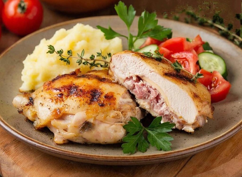 Простое блюдо, пришедшее к нам из французской кухни. Это нежный кусочек куриной грудки или телятины, начиненный сыром и ветчиной, запечённый до золотистой корочки.