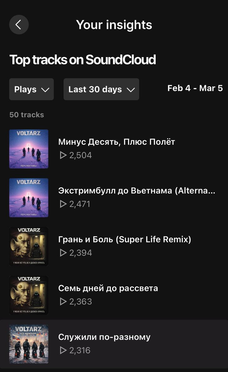 Топ-5 композиций VOLTARZ / гр.Вольтары за последние 30 дней, по мнению слушателей популярной мировой стрим-площадки SoundCloud из 56k прослушиваний за месяц творчества VOLTARZ.