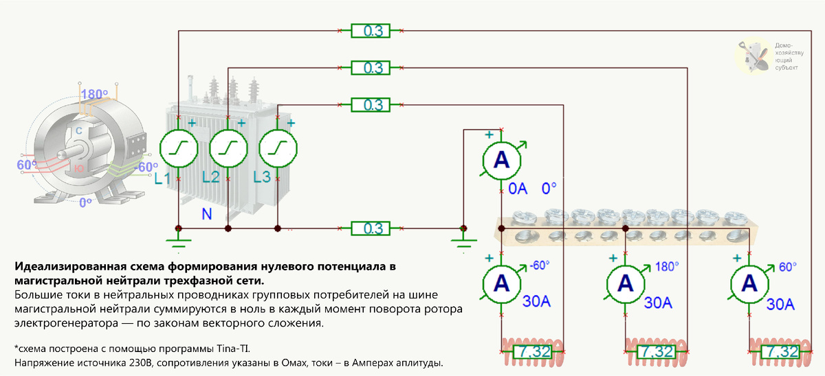 Для моделирования и анализа работы электрических цепей использована программа TINA-TI. Большие токи групповых потребителей на ШИНЕ магистральной нейтрали складываются в близкое к нулю значение ТОКА несимметрии — по закону ВЕКТОРНОГО сложения. Участие этого тока в разогреве шины пренебрежимо мало, а в идеальном случае, при полной симметрии нагрузок на фазах, оно равно нулю. Но те же большие токи групповых потребителей на отдельных КЛЕММАХ шины магистральной нейтрали дают большое значение ТЕМПЕРАТУРЫ, выделенной потребляемой мощностью — по закону АРИФМЕТИЧЕСКОГО сложения.