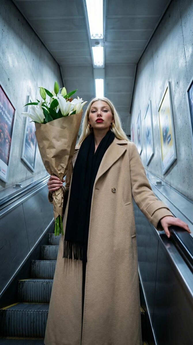 ✨✨✨✨✨✨✨✨✨✨ на эскалаторе метро с белыми лилиями для генерации такого фото: ✨ загрузи в бот @aibudka_bot свое фото (лицо должно быть хорошо видно) ✨ выбери Nano Banana Pro (обязательно ставь Pro для реалистичной генерации) ✨ параметры 2к, 9:16 (можно любые другие) ✨ вставь промпт (нажми, чтобы скопировать): Сохрани лицо с загруженного фото. Не меняй лицо. Кинематографичный снимок снизу. Женщина спускается на эскалаторе в метро, стоит ровно, одной рукой на поручне, в другой — высокий букет белых лилий в крафтовой бумаге, лилии возвышаются над её головой. Спокойный королевский взгляд вниз в камеру. Длинное бежевое кашемировое пальто, чёрный шарф, золотые серьги, красная помада. Серые стены метро, рекламные плакаты размыты, холодный свет ламп. Она единственное тёплое и живое пятно в холодном бетонном пространстве. Urban luxury editorial. 💗 https://t.me/aibudka_bot 💗 #вметро #сцветами #лилии