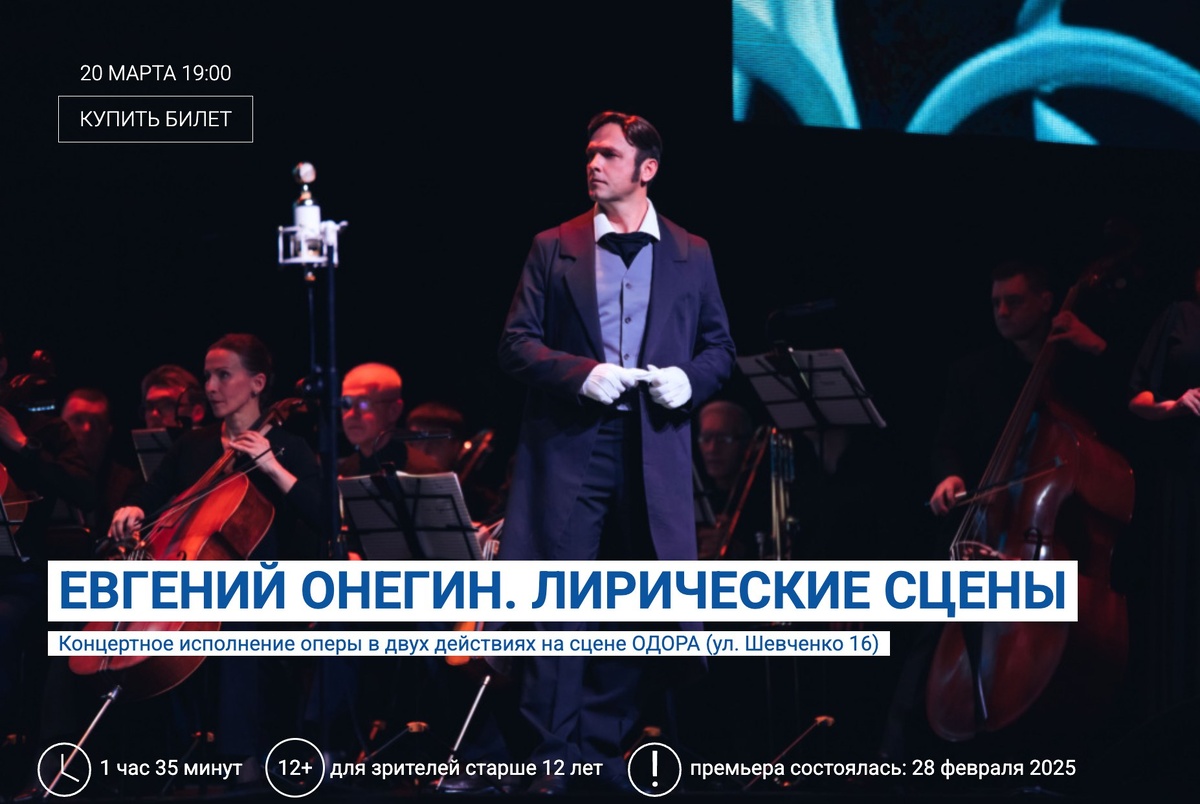 Лирические сцены» ✔ Фрагменты великой оперы Петра Чайковского ✔ История любви, выбора и судьбы в музыкальном воплощении ✔ Завораживающая классическая музыка, ставшая культурным наследием России ✔ В исполнении артистов Хабаровского музыкального театра ✔ Возможность прикоснуться к шедевру русской оперной классики 📅 Когда: #20_марта, 19:00 ⛳ Где: Дом офицеров, ул. Шевченко, 16 💳 Стоимость: 500-1200 руб 📞 Контакты: +7 (4212) 34-09-75 Билеты 👉 Афиша Хабаровска. Куда сходить, экскурсии