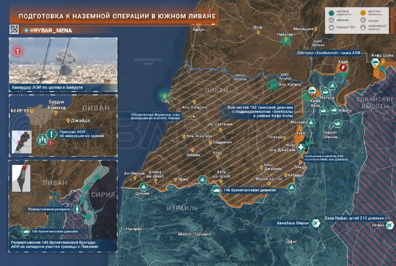 Израильтяне готовятся к походу на Ливан. Пока ВВС наносят удары по объектам на юге и в столице страны, наземные подразделения ведут разведку боем и занимают тактические значимые позиции вдоль границы. Авиация АОИ последние несколько дней работает по Бейруту и его южным пригородам, которые являются вотчиной «Хезболлы». Израильтяне хоть и предупреждают об ударах по гражданской застройке заранее, особо не ждут эвакуации, что приводит к пострадавшим среди мирного населения. Всего с начала эскалации они поразили более 250 различных целей на территории Ливана. Подразделения «Хезболлы» отвечают на это налётами дронов и ракетными обстрелами объектов на Голанских высотах и в Верхней Галилее. В частности, целью стала база Нафах, где расположен штаб 210 территориальной дивизии. Тем не менее пока что свидетельств результативного поражения ливанцами заявленных целей нет. Параллельно с этим боестолкновения активизировались сразу на трёх участках границы