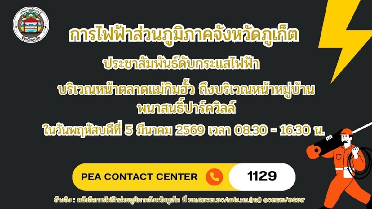 Центральная часть района Кату в районе перекрестка Си-Ко снова останется без электричества утром и днем 5 марта в связи с работами на высоковольтных линиях. Уведомление опубликовал накануне муниципалитет Кату. Из уведомления следует, что работы будут проводиться на линии электропередач, идущей вдоль северной петли Wichitsongkhram Rd. от рынка Мэ Ким Хуа (обозначен на картах как 📍Wet Market Kathu) до поселка Phanason Park Ville 📍(у поворота к вейк-парку). Предыдущее отключение света в той же части Кату (о нем мы писали здесь) затрагивало только восточную сторону шоссе Wichitsongkram Rd. Информация о зоне блэкаута 5 марта отсутствует. Время проведения работ – с 9:00 утра до16:30. Дорожное движение в зоне проведения работ также может быть затруднено. Получить дополнительную информацию можно через горячую линию Управления энергоснабжения провинций по телефону 1129. Фото: PEA Phuket