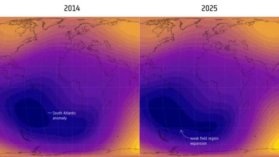 У нашей планеты есть невидимый, но жизненно важный защитник — магнитное поле. Оно отражает потоки заряженных частиц от Солнца, спасает атмосферу от выдувания и позволяет космонавтам на МКС чувствовать себя в относительной безопасности. Но у этого щита есть слабое место. Южно-Атлантическая аномалия — область над Атлантическим океаном и Южной Америкой, где магнитное поле Земли значительно слабее, чем в других регионах. Это похоже на вмятину в защитной сфере, через которую космическая радиация проникает ближе к поверхности. И, судя по новым данным, эта "вмятина" стремительно растет. Европейское космическое агентство уже больше десяти лет следит за магнитным полем с помощью спутниковой программы Swarm. Три одинаковых аппарата на низкой орбите измеряют мельчайшие изменения геомагнитного поля, и результаты их работы заставляют ученых нервничать. Главный вывод: с 2014 года Южно-Атлантическая аномалия расширилась на территорию, сопоставимую с половиной континентальной Европы. Это огромная площ