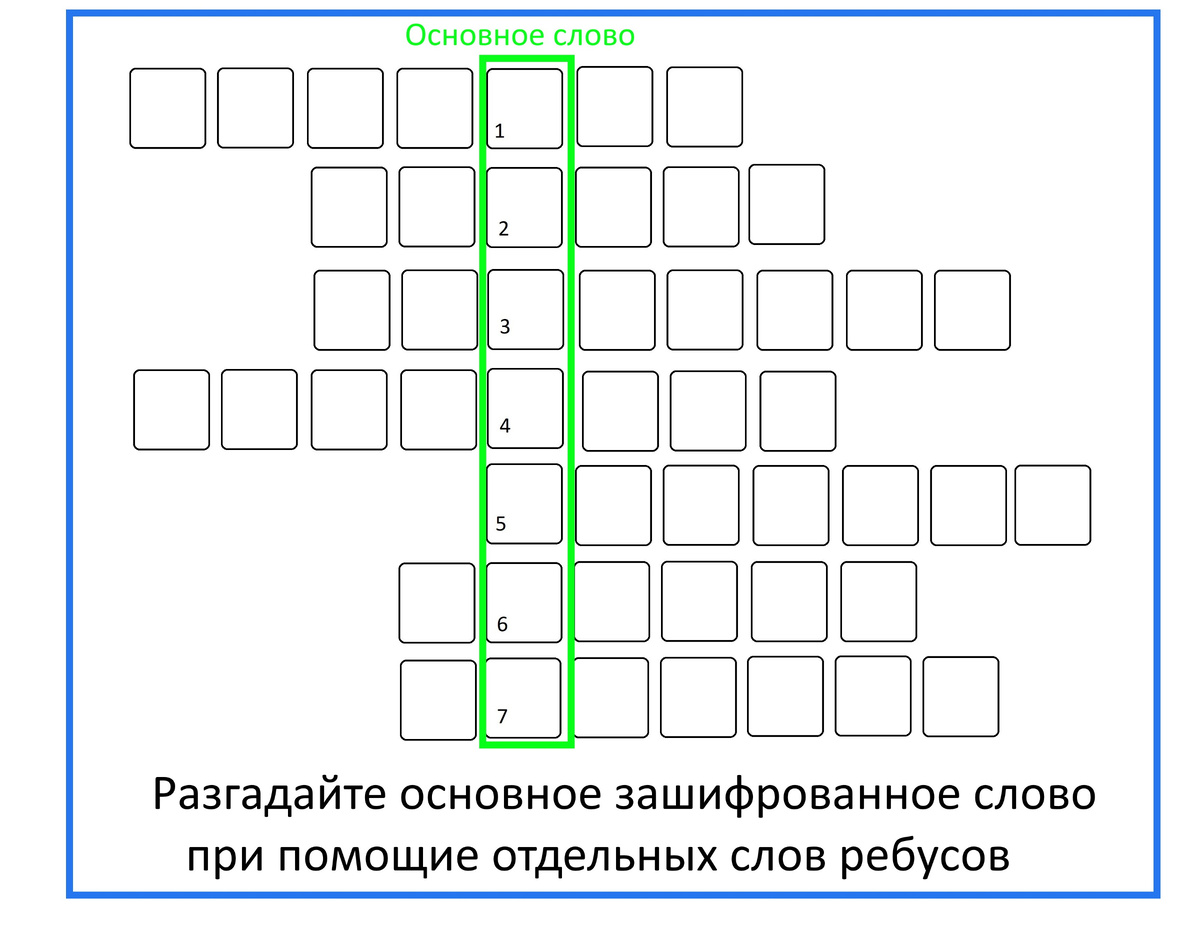 Перед вами игровое поле с зашифрованными словами. В качестве подсказки, к каждому слову дан ребус. Заполните все слова отгадав ребусы и узнаете что за основное слово было загадано. Правила отгадывания ребусов приведены внизу.