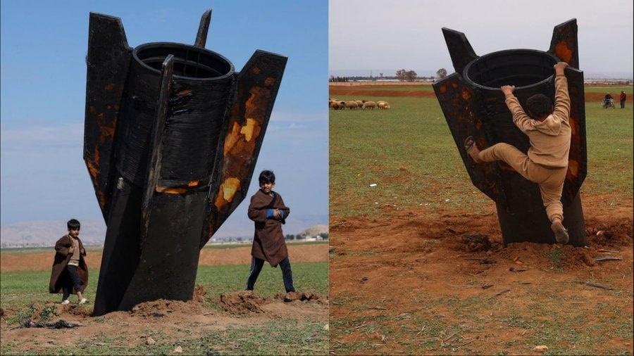 Kids climb UNEXPLODED missile — Epstein media film them