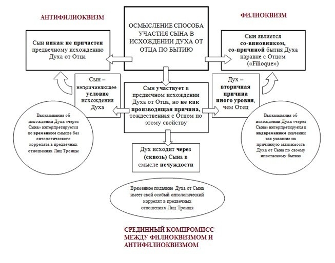 P.P.S. На фото – схема из моей кандидатской диссертации, которую я защитил в 2016 г., где я систематизировал типовые возможности понимания вопроса об исхождении Духа в Троице. Пройдет время, меня размотает по жизни, и, работая в такси, я увижу, как эти абстракции работают у нас на земле.