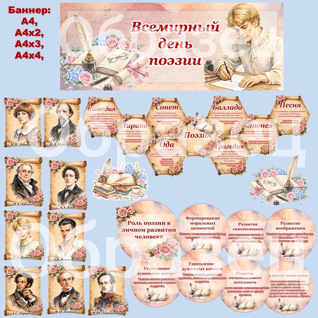 Готовый комплект для оформления класса к занятию, посвящённому Всемирному дню поэзии. Материал идеально подходит для проведения классного часа, внеурочных мероприятий, тематической недели русского языка и литературы.