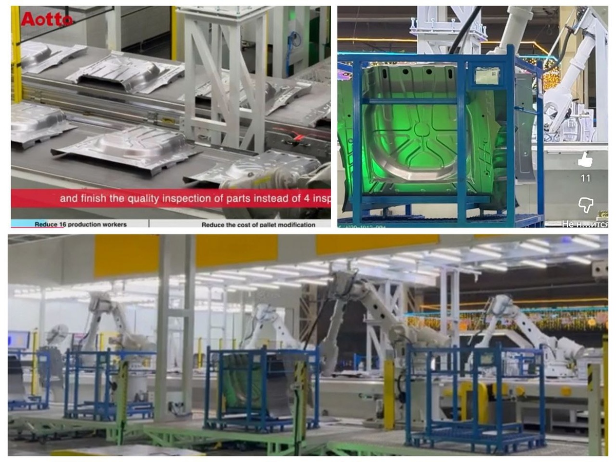 В интересном видеоролике от корпорации Jinan Aotto Automation Co. можно увидеть реализованное комплексное решение по дополнительной роботизации и увеличению производительности прессовой линии Geely на примере конкретного потока штампов для ниши запасного колеса (задней панели заднего пола). Чаще всего роботизированную укладку мы видим для крупных «лицевых» панелей типа боковин или крыш на тандемных или трансферных прессовых линиях размера XL. Но вот в данном случае речь о крупной структурной детали - такое можно увидеть нечасто. Итак, роботизированная укладка была внедрена по обе стороны от выходного конвейера линии, доставку пустой тары и отвоз заполненных деталями контейнеров на склад осуществляют автоматические тележки AGV - вместо вилочных погрузчиков. Далее языком сухих цифр: - 4 промышленных робота на укладке заменили 8 людей-укладчиков; - система автоматического контроля качества (со специальной оптикой и обученный нейросетью) заменила 4 контролеров качества (надо понимать,