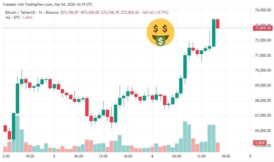 🧪 Цена резко прыгнула до $73k после открытия фондового рынка, когда в моменте объем покупок биткоинов на биржах резко вырос до $121,6 млн. Есть версия, что иранцы начали массово перекладываться в BTC для защиты своих средств 💸 📢 Внимание, ты хочешь создавать продающие посты и ролики? 🔥 ЗАБИРАЙ ПОДАРОК- 5 уникальных формул, которые точно продадут благодаря захватывающему контенту! ✅ ПОДАРОК