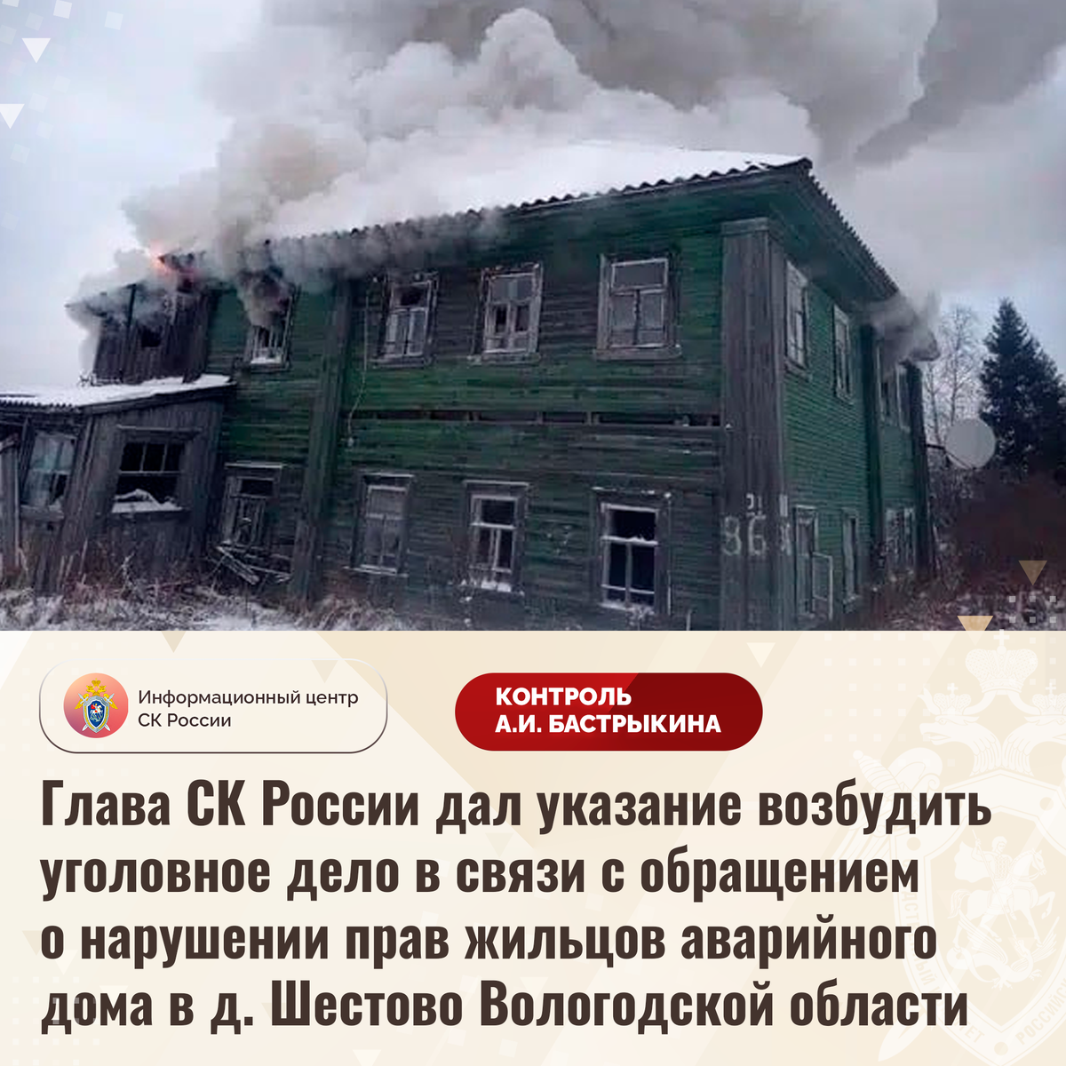 Глава СК России дал указание возбудить уголовное дело в связи с обращением о нарушении прав жильцов аварийного дома в д. Шестово Вологодской области В приёмную Председателя СК России А.И. Бастрыкина в социальной сети «ВКонтакте» обратилась жительница Вологодской области по вопросу нерасселения ее семьи из многоквартирного дома в деревне Шестово. В 2017 году деревянное здание 1922 года постройки ввиду высокой степени физического износа конструкций признано аварийным и подлежащим сносу. В декабре прошлого года в строении произошел пожар, из-за чего оно оказалось значительно повреждено. Вместе с тем до настоящего времени дом не включен в программу по расселению, мер к предоставлению гражданам благоустроенного жилья не принимается. Обращения в компетентные органы результатов не принесли. В СУ СК России по Вологодской области организована процессуальная проверка. Председатель Следственного комитета Российской Федерации Александр Иванович Бастрыкин дал указание руководителю СУ СК России по