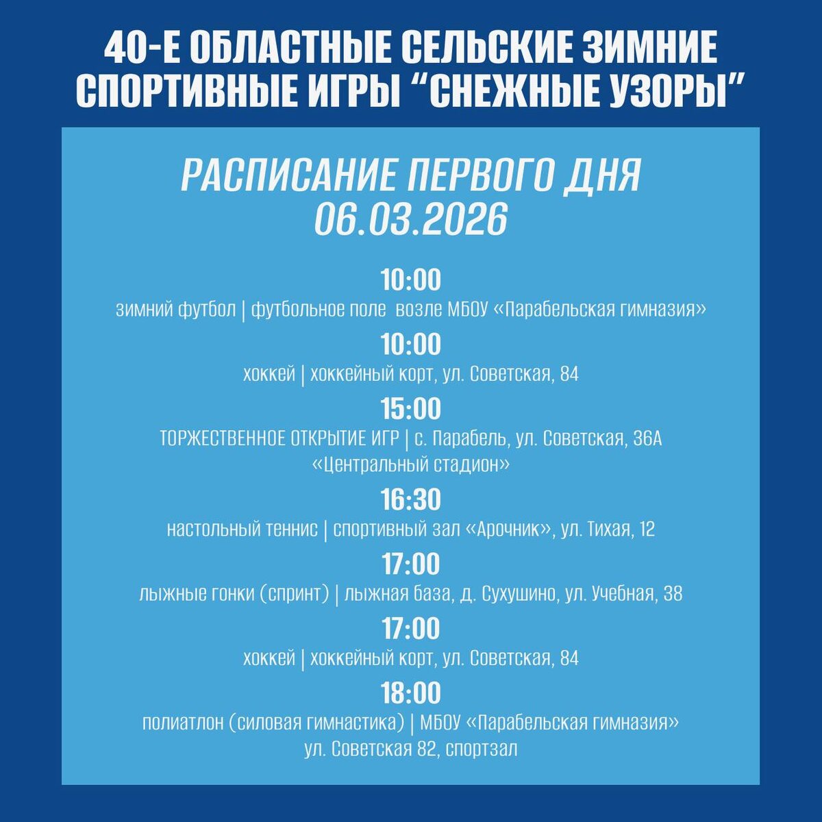 Дорогие друзья! Жители и гости Парабельского района! Завтра в 15:00 на центральном стадионе мы открываем юбилейные 40-е областные сельские зимние спортивные игры «Снежные узоры». Это уникальный шанс увидеть захватывающие соревнования своими глазами, зарядиться энергией и, конечно, поддержать команды! До встречи на стадионе!