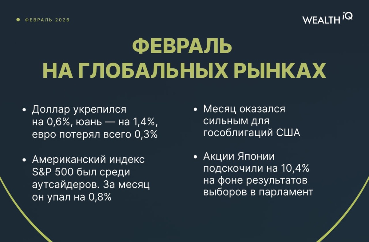💬 Кирилл Комаров, CFA, директор по аналитике Wealth IQ 🔘Макростатистика Статистика по США, выходившая в феврале, выглядела оптимистично. Инфляция снизилась, хотя и остается выше таргета в 2%. Рынок труда порадовал снижением безработицы и ростом числа рабочих мест. В еврозоне базовый показатель инфляции в феврале неожиданно подскочил, впрочем, не так сильно. Деловые настроения продолжают улучшаться. В Китае инфляция держится в плюсе четвертый месяц подряд, но в последний месяц снизилась. Ставки остаются на тех же уровнях девятый месяц подряд. Для курса доллара (DXY) февраль стал месяцем восстановления. Из-за геополитических новостей и падающего рынка акций спрос на резервную валюту вырос. Доллар укрепился на 0,6%. Евро при этом потерял всего 0,3%, юань укрепился на 1,4%, иена упала на 0,8%. 🔘Акции Февраль был волатильным для рынков акций. Американский индекс S&P 500 был среди аутсайдеров. За месяц он упал на 0,8% на фоне коррекции в IT-секторе. Развивающиеся рынки продолжали ро
