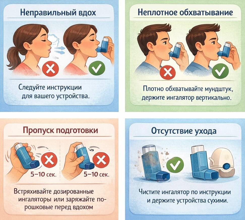 Неправильная техника ингаляции — одна из самых частых причин, из‑за которой симптомы астмы сохраняются, несмотря на назначенное лечение. Даже при правильно подобранных препаратах часть дозы может не попадать в дыхательные пути, если ингалятор используют неверно. Ниже — ключевые ошибки и как их избежать. Неправильный выбор устройства