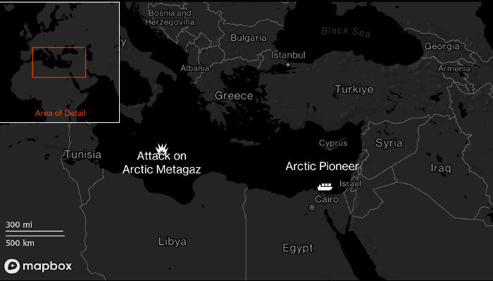 В феврале газовоз Arctic Pioneer доставил партию СПГ в Китай и в начале марта возвращался в российские воды, когда был атакован другой газовоз, «Арктик Метагаз», пишет Bloomberg со ссылкой на данные по движению судов. Текущее местонахождение газовоза Arctic Pioneer и место атаки на газовоз «Арктик Метагаз». Источник: Bloomberg Российский газовоз, находящийся под санкциями США, прервал свой путь в Средиземном море после того, как еще одно такое судно было, предположительно, атаковано украинскими морскими дронами. Об этом пишет Bloomberg со ссылкой на данные по движению судов. СПГ-танкер Arctic Pioneer (под флагом России), использовавшийся для перевозки топлива с подсанкционного завода «Арктик СПГ 2», стоит на якоре неподалеку от египетского Порт-Саида с 3 марта, сообщает Bloomberg. Примерно тогда же другой российский газовоз, «Арктик Метагаз», также находящийся под санкциями США за перевозку подсанкционного российского СПГ, был атакован Украиной в тех же водах, отмечает агентство. В фев