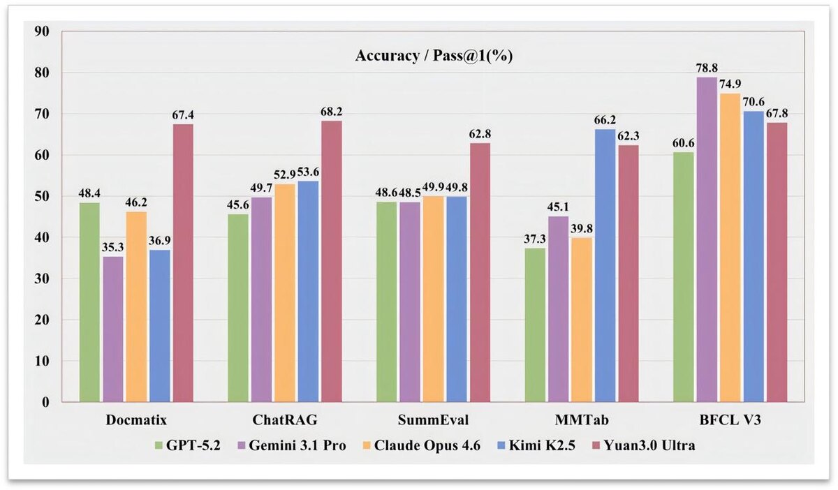 Модель с триллионом параметров буквально «удалила половину своего мозга» и стала умнее. Yuan3.0 Ultra**-— новая open-source мультимодальная **MoE-модель от Yuan Lab. Всего 1010 млрд параметров, но при инференсе активны только 68.8 млрд. На бенчмарках RAG она обошла GPT-5.2, Gemini 3.1 Pro и Claude Opus 4.6 с заметным отрывом. Например: - 67.4% на Docmatix против 56.8% у GPT-4o Что умеет модель: - Enterprise RAG - 68.2% средней точности на 10 задачах поиска - Анализ сложных таблиц - 62.3% на бенчмарке MMTab - Text-to-SQL - 83.9% на Spider 1.0 - Мультимодальный анализ документов с контекстом 64K Ключевая инновация — Layer-Adaptive Expert Pruning (LAEP). Во время предобучения у MoE возникает сильный дисбаланс: некоторые эксперты получают в 500 раз больше токенов, чем другие. LAEP постепенно удаляет малоиспользуемых экспертов слой за слоем, что позволяет: - сократить 33% параметров - увеличить эффективность обучения на 49% Также исследователи улучшили метод “fast-thinking” RL.
