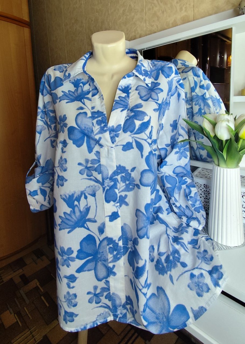 Тонкая, нежная на ощупь ткань, но при этом не просвечивает. В идеальном состоянии . Размер XL российский размер 52-54. Прямой крой, по бокам внизу небольшие разрезы. V образный вырез впереди ( не застёгивается). Рукав 3/4, можно носить распущенным, можно застегнуть на пуговицу, при этом сделав его короче. Сзади вытачка. Сзади блузка блинее, чем спереди. Длина по переду - 68 см По спинке - 78 см Длина рукава - 41 см Ширина рукава по низу - 15 см Ширина проймы - 27 см Полуобхват груди - 68 см Цена 1600 рублей + пересылка