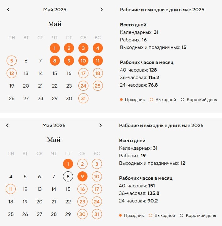 Производственный календарь на май 2025 и 2026