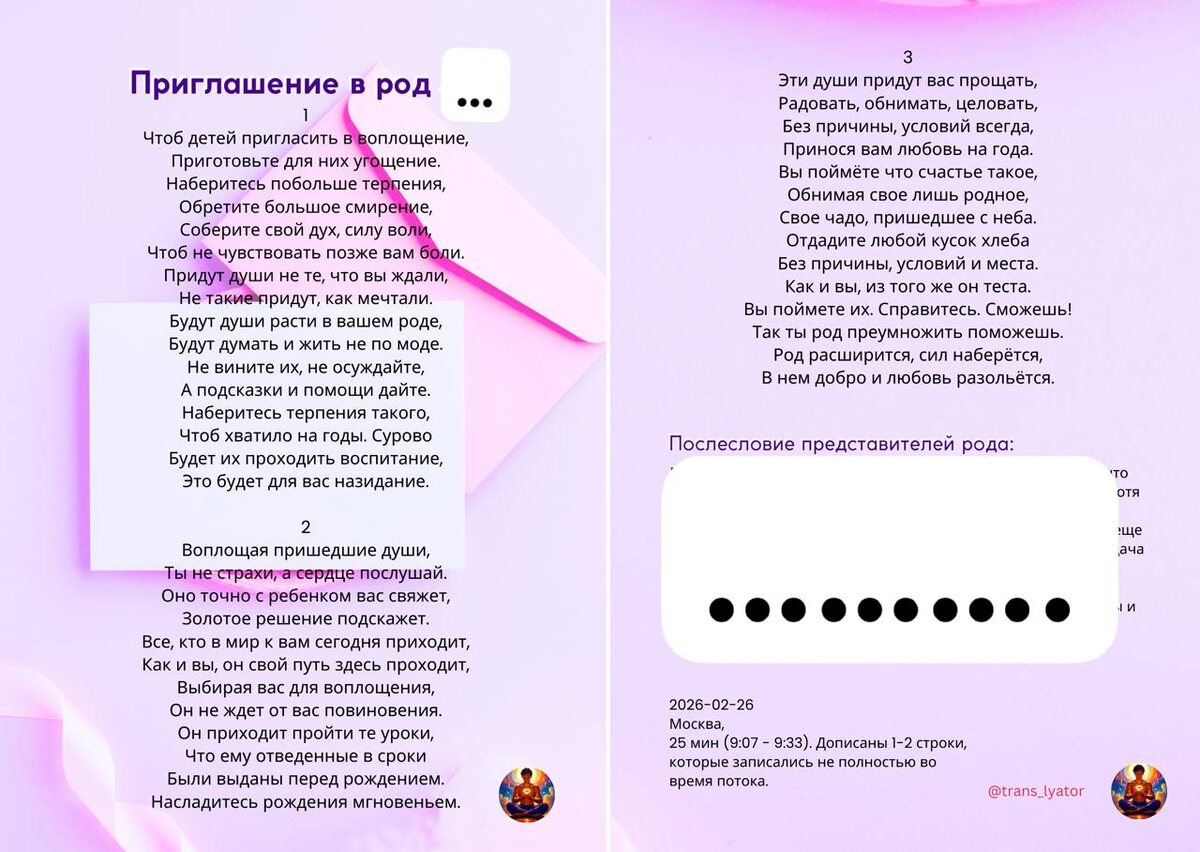 ... #подзаказ стихи 1 Чтоб детей пригласить в воплощение, Приготовьте для них угощение. Наберитесь побольше терпения, Обретите большое смирение, Соберите свой дух, силу воли, Чтоб не чувствовать позже вам боли. Придут души не те, что вы ждали, Не такие придут, как мечтали. Будут души расти в вашем роде, Будут думать и жить не по моде. Не вините их, не осуждайте, А подсказки и помощи дайте. Наберитесь терпения такого, Чтоб хватило на годы. Сурово Будет их проходить воспитание, Это будет для вас назидание. 2 Воплощая пришедшие души, Ты не страхи, а сердце послушай. Оно точно с ребенком вас свяжет, Золотое решение подскажет. Все, кто в мир к вам сегодня приходит, Как и вы, он свой путь здесь проходит, Выбирая вас для воплощения, Он не ждет от вас повиновения. Он приходит пройти те уроки, Что ему отведенные в сроки Были выданы перед рождением. Насладитесь рождения мгновеньем. 3 Эти души придут вас прощать, Радовать, обнимать, целовать, Без причины, условий всегда, Принося вам любовь на г