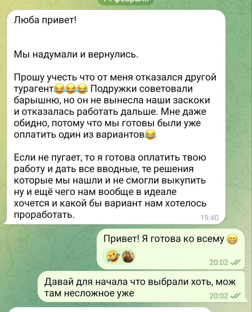 Я долго ходила вокруг этой темы, думала как корректно преподнести, чтоб народ не распугать. И тут прям вот история получилась, вот и пост готов. В общем ещё по осени одна наша подписчица спрашивала у меня про сложный тур в Турцию. Сложный он тем, что там надо запихать в номер аж 8 человек. При этом бюджет совсем не на виллу, да и не хотят они виллу. Как старый солдат, не знающий слов любви, я оценила навскидку сколько времени я потрачу именно на поиск подходящего отеля. Плюс надо будет запрашивать операторов или сами отели, в общем поняла, что дело трудоёмкое. На такие случаи у меня есть система предоплаты. Турист вносит условные 10 тысяч или сколько там договорились. Я начинаю работу. Когда мы все подобрали, то уже оплаченная сумма идёт в зачёт стоимости, то есть консультация получается бесплатно для туриста в итоге. А если же тур купили не у нас, то человек заплатил за мою консультацию, оплатил мое потраченное время. Знаю знаю, что тут щас будет куча возмущения, рассказы типа "