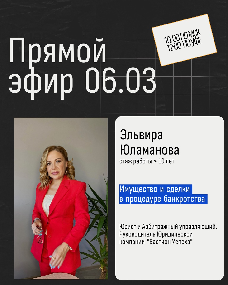 https://vk.com/bastionuspeha На эфире поговорим про Имущество и сделки в процедуре банкротства. Мы разберем : какое имущество заберут в процедуре , как обезопасить себя, свих близких и не навредить в банкротстве Если хотите подключиться, подписывайтесь в ВК, чтобы не пропустить Эфир