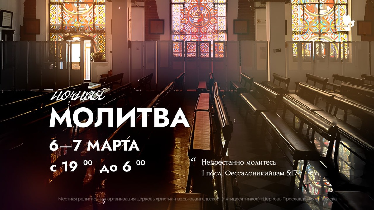 ! Обращаем ваше внимание на изменения в расписании: пятничные служения отменяются. НО возобновляются МОЛИТВЕННЫЕ СЛУЖЕНИЯ. Первое состоится уже завтра, в 19:00. И это будет особый вечер! Сразу после молитвенного служения мы начнем НОЧНУЮ МОЛИТВУ, которая продлится до утра. 🔔 Расписание на 6 марта: • 19:00 — Молитвенное служение • 22:00 — Начало ночной молитвы (до 6:00 7 марта) 📍Место: Храм, г. Томск, ул. Ивановского, 2а ✨Не пропустите время Божьего присутствия!