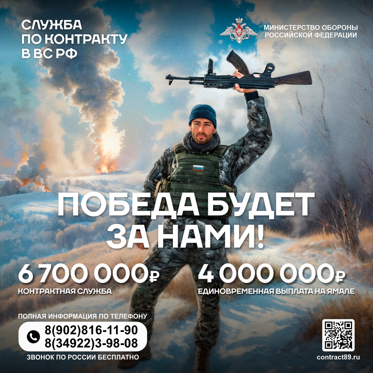 ⚡️ ❗️Лучшие условия в стране ❗️Единовременная выплата сразу при заключении контракта 4 млн. рублей (3,6 млн региональных + 400 тыс. рублей федеральных) ❗️Годовой доход в зоне СВО если уходишь от Ямала - 6.7 млн. рублей. ❗️Льготы и гарантии для всей семьи Подробности по требованиям, заработной плате и гарантиям на сайте https://clck.ru/34KYXu 📱Хотите заключить контракт? Звоните +7 (34940) 2-12-53, 2-01-02 или приходите в военный комиссариат Тазовского района по адресу: п. Тазовский, ул. Почтовая, д. 12.