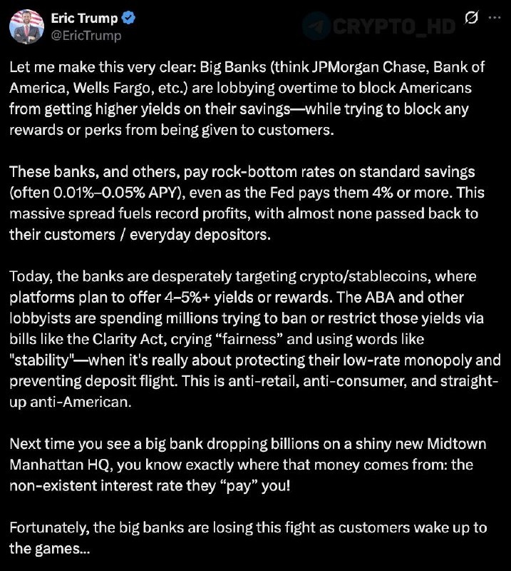 Β«ΠΡΡΠΏΠ½ΡΠ΅ Π±Π°Π½ΠΊΠΈ (JPMorgan Chase, Bank of America, Wells Fargo ΠΈ Π΄Ρ.) Π°ΠΊΡΠΈΠ²Π½ΠΎ Π»ΠΎΠ±Π±ΠΈΡΡΡΡ Π·Π°ΠΏΡΠ΅Ρ Π΄Π»Ρ Π°ΠΌΠ΅ΡΠΈΠΊΠ°Π½ΡΠ΅Π² ΠΏΠΎΠ»ΡΡΠ°ΡΡ Π±ΠΎΠ»Π΅Π΅ Π²ΡΡΠΎΠΊΡΡ Π΄ΠΎΡ